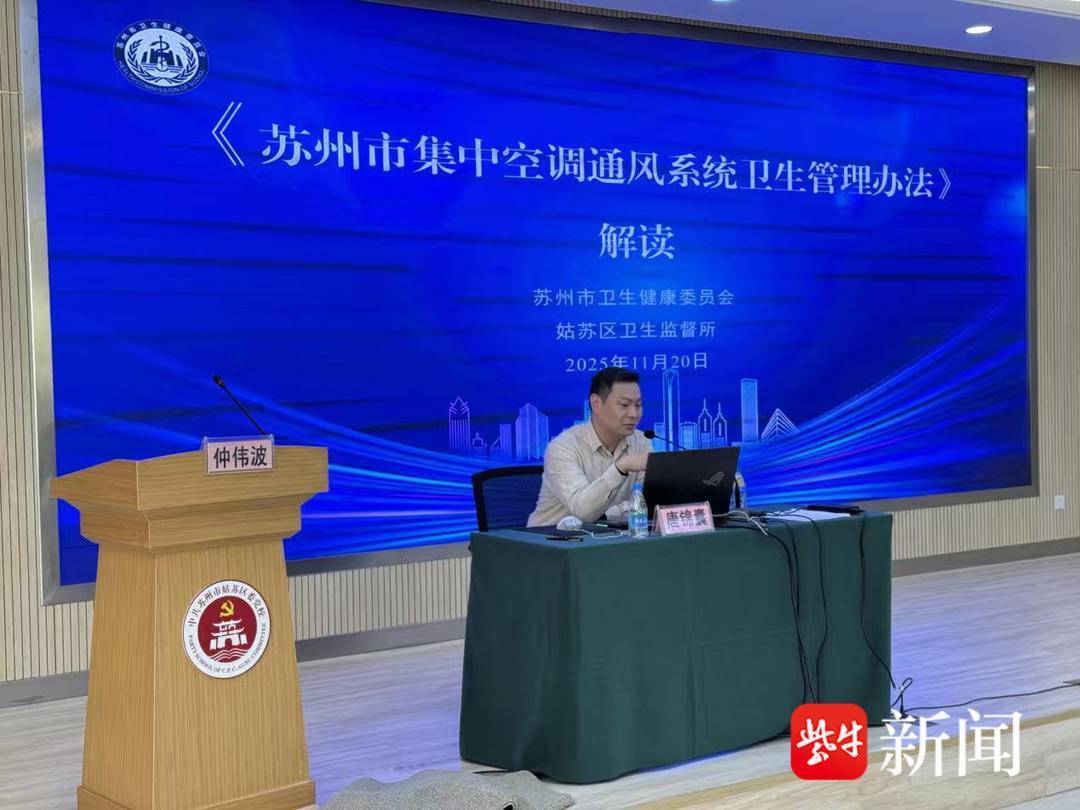 为进一步强化公共场所集中空调通风系统卫生监管效能,精准防范空气传播性疾病传播风险,保障辖区群众身体健康,11月20日,苏州姑苏区卫生监督所聚焦辖区内医疗机构、体育场馆、机关大楼及重点公共场所等集中空调使用单位,组织开展《苏州市集中空调通风系统卫生管理办法》(以下简称《办法》)专项培训,实现重点场所监管对象全覆盖。