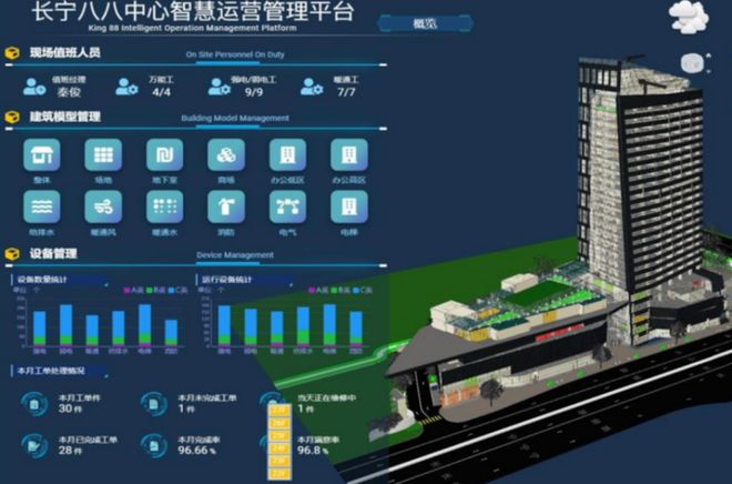 上实服务,一方面,构建全链路数字化落地,推动物管服务整体增效。例如在长宁八八项目上,依托BIM基础数据库,整合视频监控及物联网传感器,全面构建设施设备运行状态与能耗数据的实时监测体系。通过一体化大屏实现集成分析,可察可控,保障设施安全,降低能源消耗,助力低碳环保,实现绿色、节能、可持续的高质量运营目标。